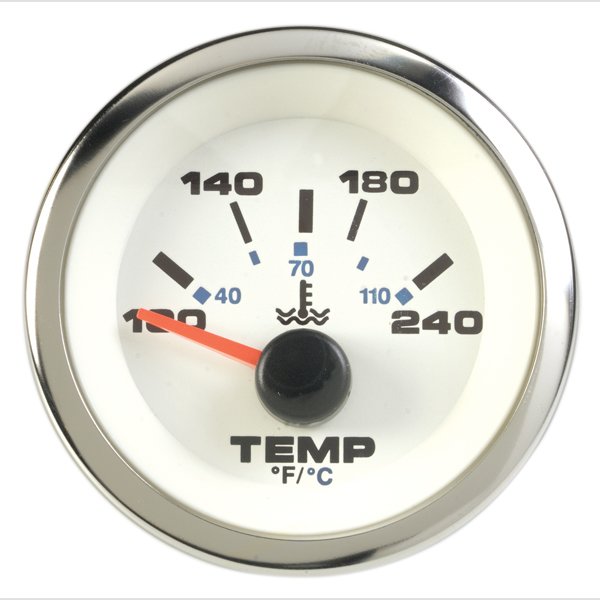 Датчик температуры Teleflex выделяется своим современным дизайном с белым циферблатом и черной, синей графикой, обеспечивая отличную читаемость показаний. Подсветка прибора позволяет удобно считывать данные в условиях низкой освещенности. Температурный диапазон от 120° до 240°F (от 40° до 110°C) делает его универсальным для большинства двигателей.