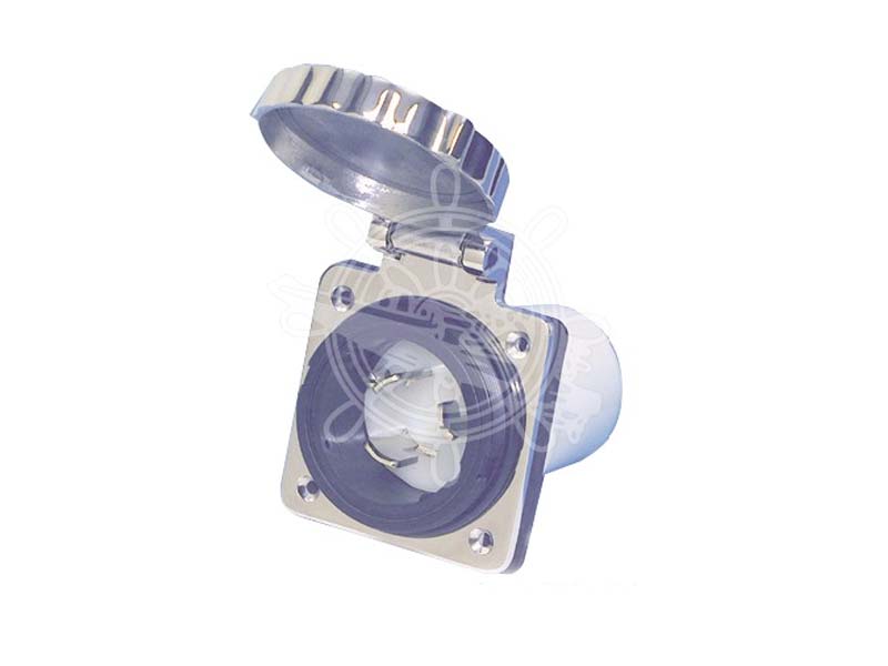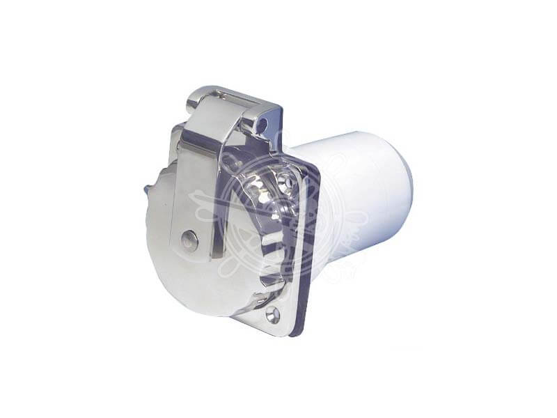 Надежный сетевой разъем OSCULATI 50 A из нержавеющей стали для подключения к береговому питанию. Защита от влаги и грязи.