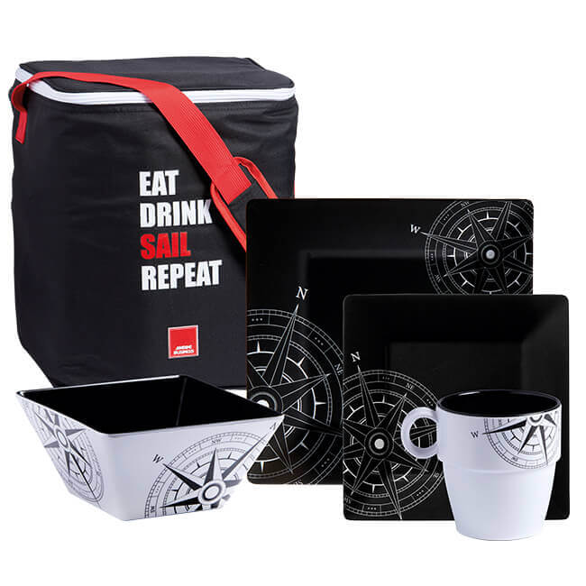 6 тарелок, 6 суповых тарелок, 6 десертных тарелок, 6 штабелируемых нескользящих кружек, сумка для переноски
