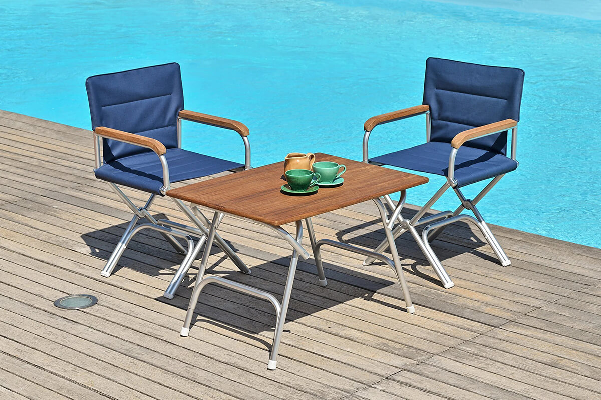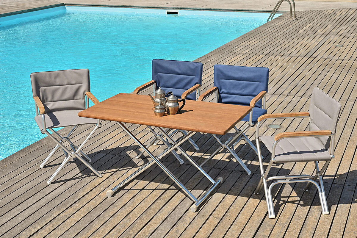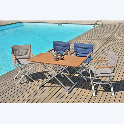Стул изготовлен из прочного анодированного алюминия и высококачественной ткани Linetex PERMACOOL, что обеспечивает долговечность и устойчивость к внешним воздействиям. Уникальная технология обработки ткани позволяет снижать температуру сиденья, что особенно актуально в солнечные дни. Кроме того, стул имеет тиковые подлокотники, что добавляет дополнительный комфорт и стиль.