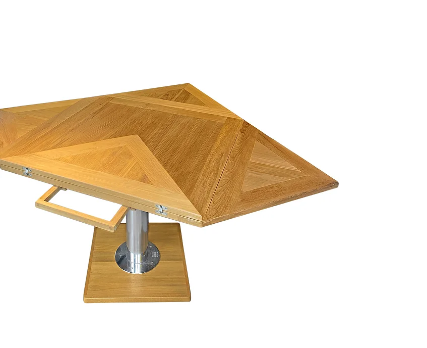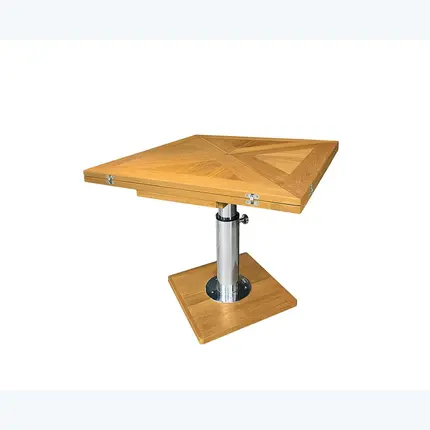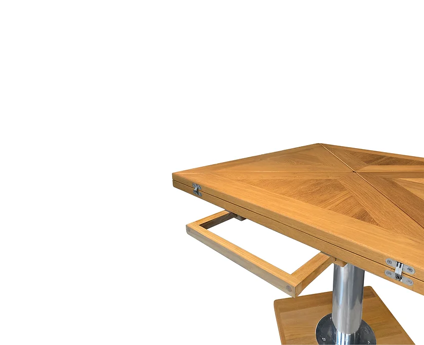 Стол Mia Marin Delta отличается уникальным сочетанием материалов: столешница из бурманского тика и ножки из нержавеющей стали 316L. Регулируемые хромированные ножки позволяют изменять высоту стола, что делает его универсальным — его можно использовать как обеденный стол высотой 70 см или как кофейный столик высотой 40 см. Это функциональное решение для любого яхтенного интерьера.