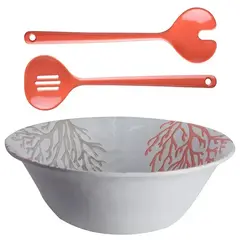 Набор из 3 предметов: большая меламиновая салатница с удобными сервировочными ложками, идеален для семейных обедов.