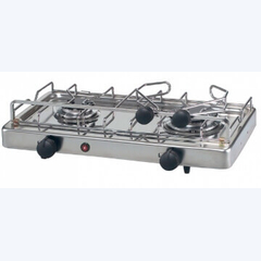 Компактная газовая плита Smev 927 с раковиной и двумя конфорками, выполненная из нержавеющей стали для долговечности и удобства использования.