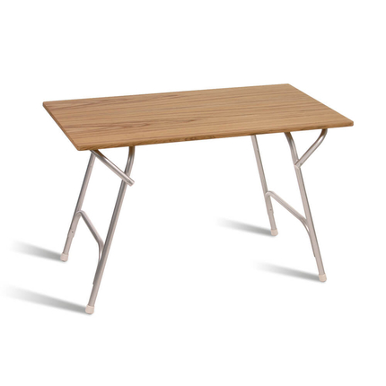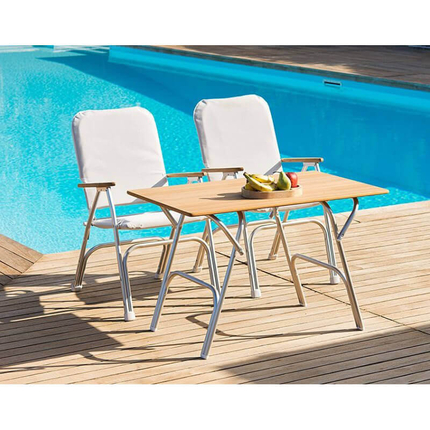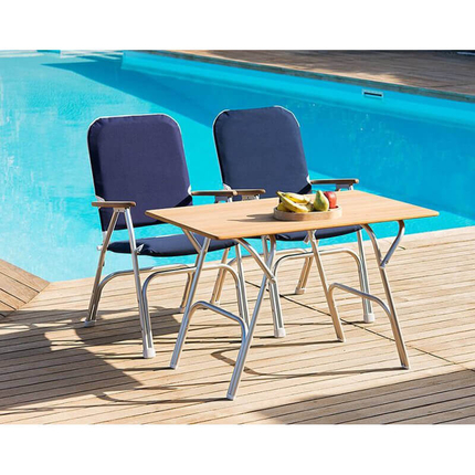Складной стол легко устанавливается и не требует специального инструмента. Он отлично сочетается с другими яхтенными аксессуарами и мебелью из тика, создавая гармоничный интерьер на борту.