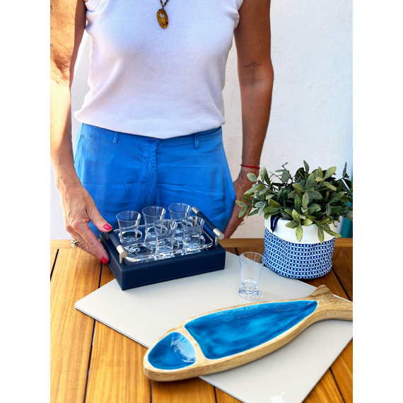 Kadeh Tepsisi - Bej - Small представляет собой компактный поднос светло-бежевого цвета, предназначенный для удобного размещения и транспортировки стопок. Изготовленный из искусственной кожи и акрила, этот поднос сочетает в себе практичность и эстетическую привлекательность, что делает его идеальным аксессуаром для использования на палубе яхты или катера. Конструкция подноса состоит из двух частей: съемной акриловой секции, которую можно использовать отдельно в качестве подноса или небольшого отделения для хранения мелких предметов, таких как ключи, монеты или солнцезащитные очки. Такая конструкция облегчает уход и обеспечивает удобство в использовании. Дизайн выполнен в морском стиле, что позволяет использовать поднос не только как функциональный элемент, но и как декоративный аксессуар, гармонично дополняющий интерьер судна. Kadeh Tepsisi станет практичным дополнением к палубному оборудованию, особенно для любителей комфортного отдыха и приема напитков на борту.