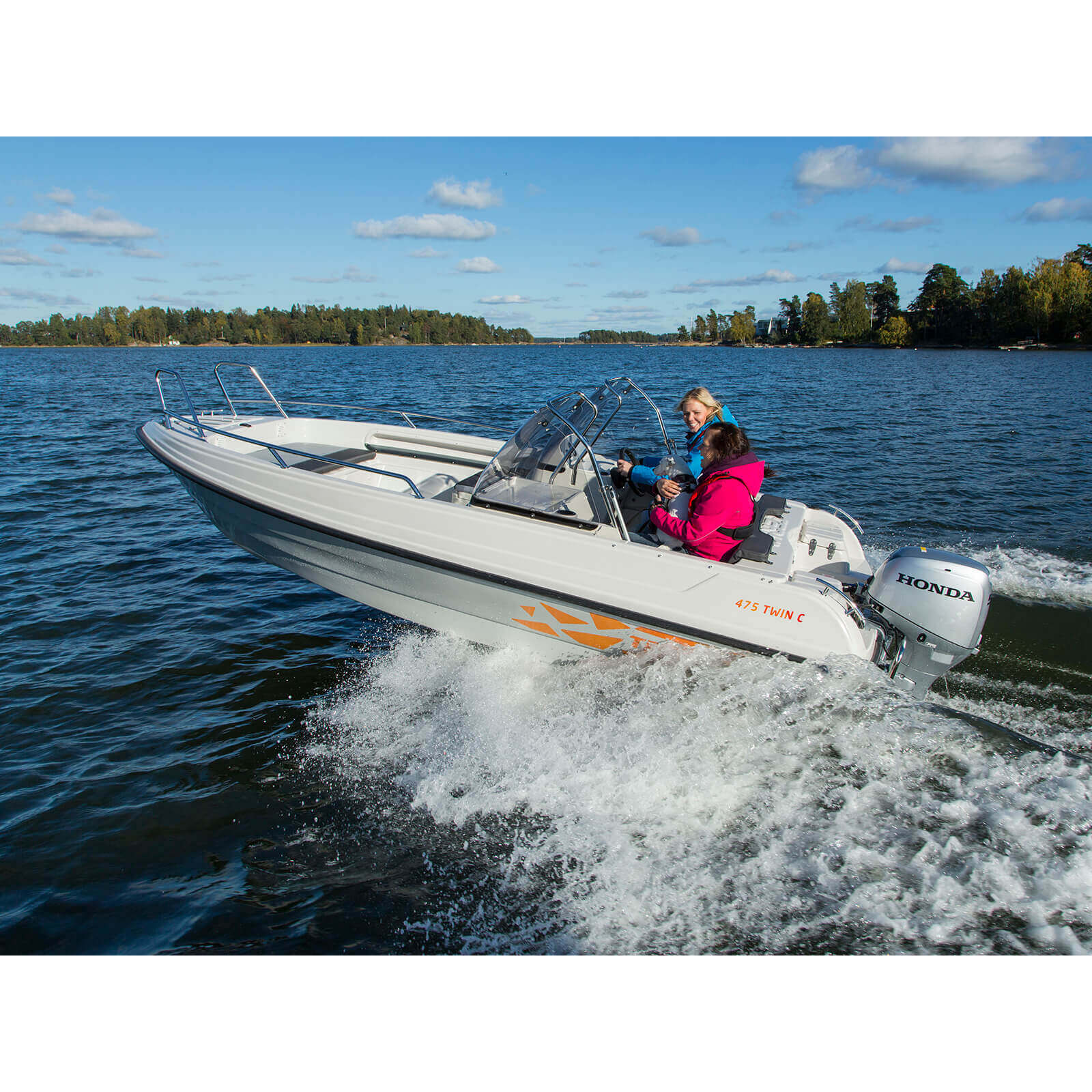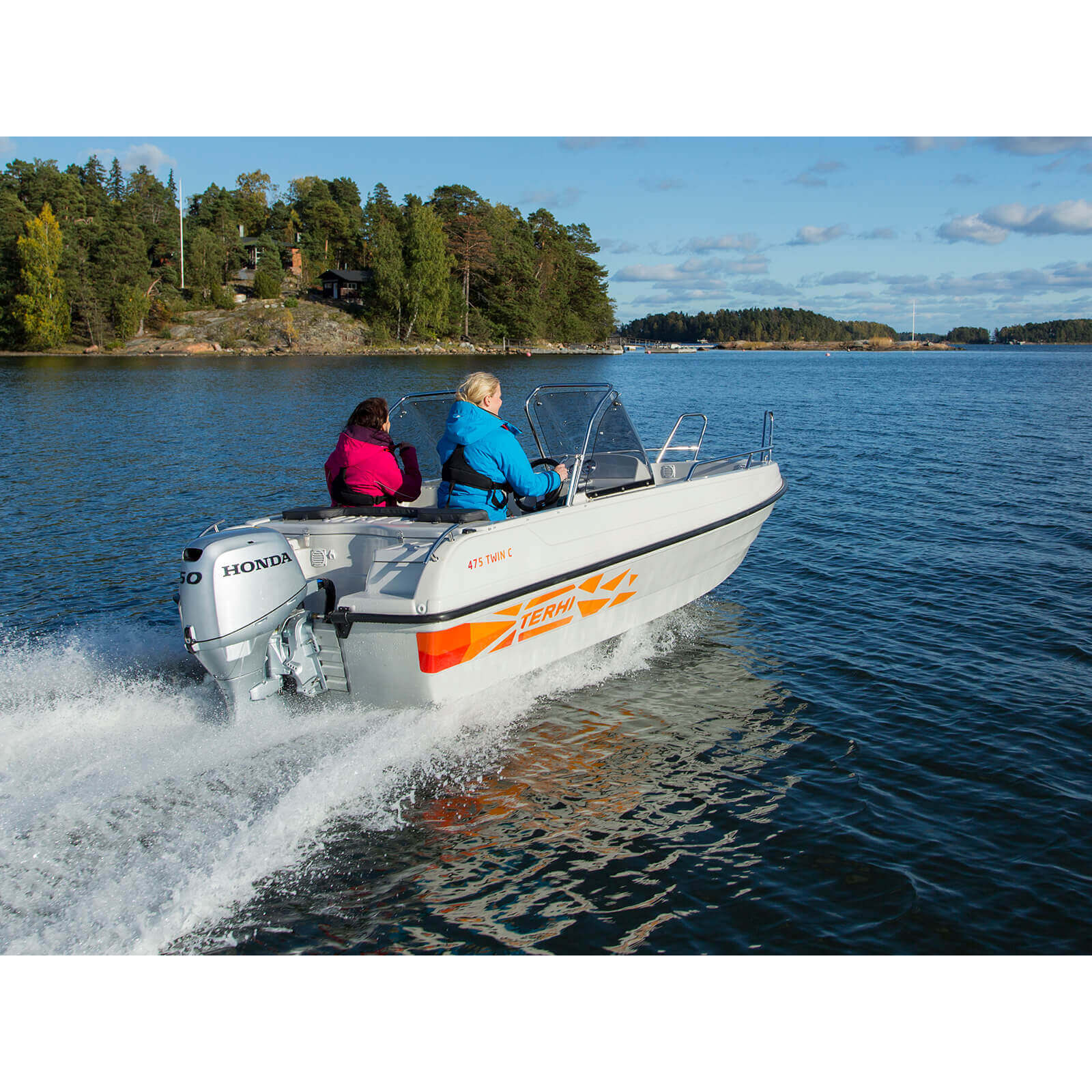 Комплектация лодки включает множество дополнительных элементов, повышающих удобство эксплуатации: оснащение 12-вольтовым источником питания, удобные рукоятки для захвата, носовые и кормовые кнехты, навигационные лампы, противоскользящие полосы на бортах, лестницу для удобного захода в воду, а также огнетушитель и ремонтный комплект. TERHI 475 TWIN C сертифицирована по европейским стандартам CE/C, что подтверждает её соответствие требованиям безопасности и качества.
