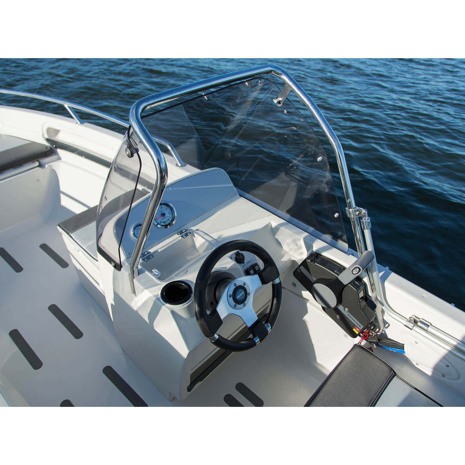 Конструкция корпуса и палубы выполнена из ABS-пластика, что обеспечивает прочность и устойчивость к воздействию морской среды. Для обеспечения безопасности лодка имеет неутопляемую конструкцию и оснащена системой водоотведения. В качестве материала для плавучести применяется полиуретан, а ветровое стекло выполнено из акрилового материала. Управление лодкой осуществляется через стандартный румпель с длиной рулевого троса 2,7 метра, а длина троса газа составляет 3 метра, что обеспечивает комфортное и точное управление.